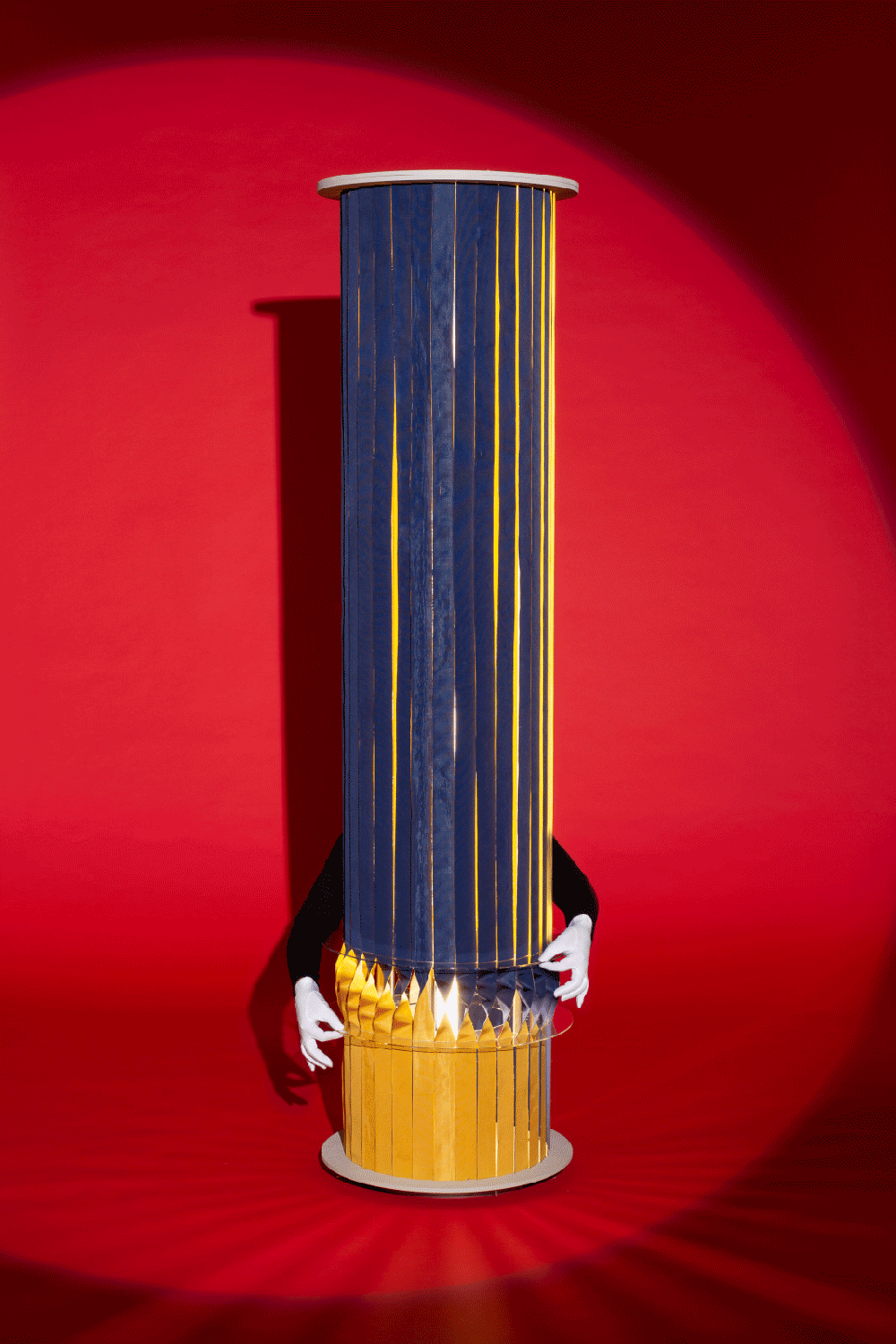 Lamp inspired by the « quick change clothes » trick. It reproduces the change of the outer layer. A simple mecanism twists bicolor straps. The plexiglass circular center is a reference to the magician's hoop.